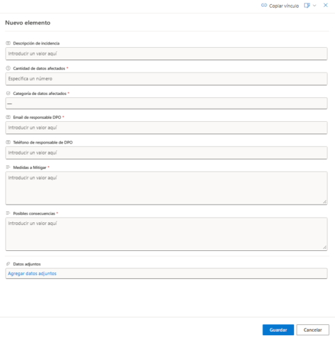 - Seleccionar Ley de protección de datos- formulario de incidentes